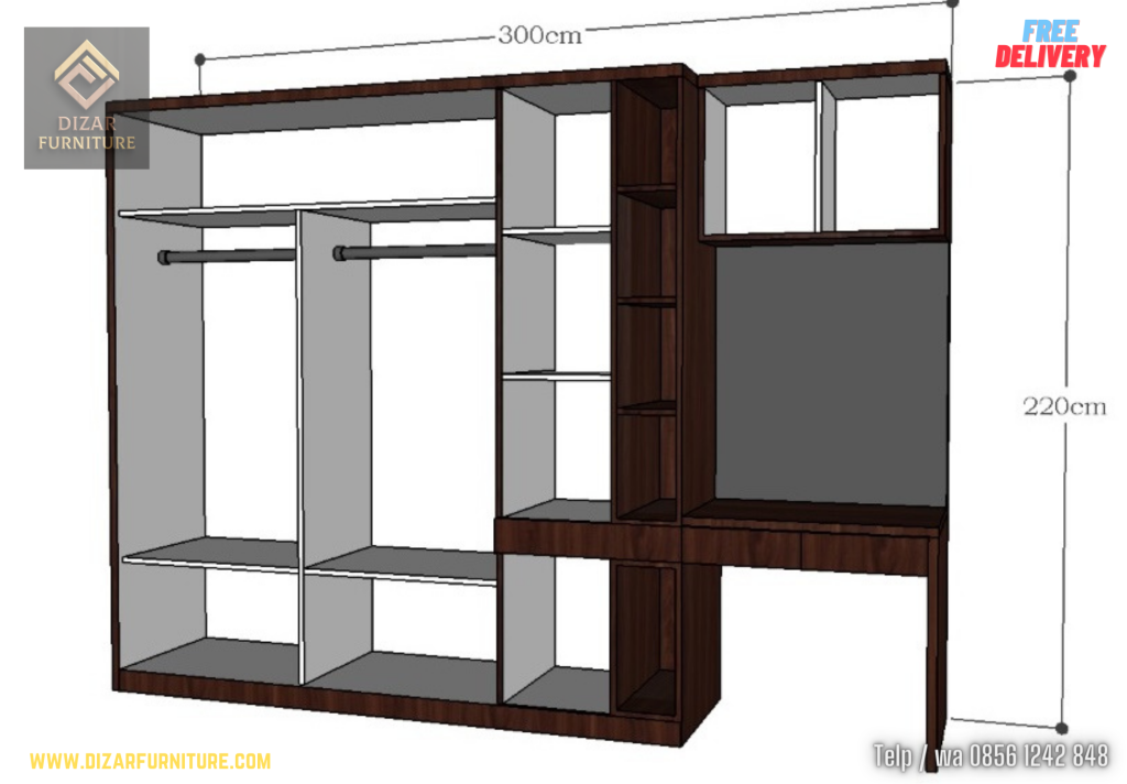 Bagi Anda yang ingin membuat lemari pakaian dan meja rias custom sesuai kebutuhan, segera hubungi Dizar Furniture di 0856 1242 848 (Telp/WA).
